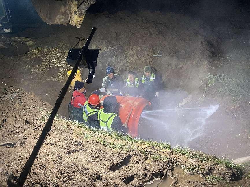 1月29日(腊月27)晚7时左右,杨古水厂北侧主管道漏水。周村项目公司立即启动重大节日期间供水抢修应急预案